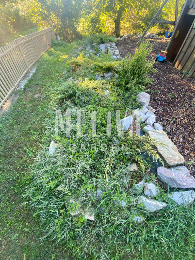 Initially, we set aside all the rocks, began weeding, and pruned the plants that could be saved. We removed the agro-fabric, as it was not suitable for this purpose.
