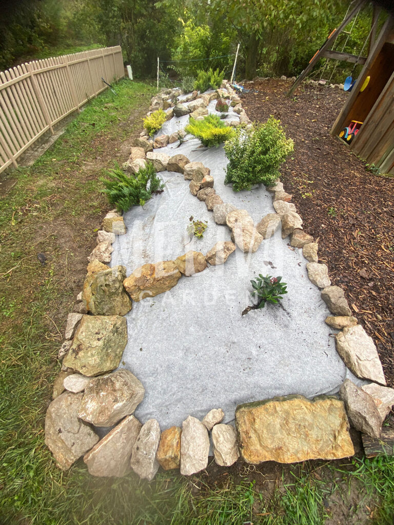During the planning and planting of new vegetation, we also placed geotextile underneath the rock garden.