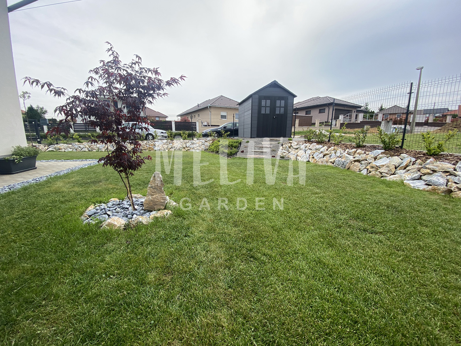 Megrendelőnek határozott elképzelése volt a növényekkel és a kialakítással kapcsolatban is. A melléképület alapját is mi betonoztuk, illetve a lépcsőt is mi helyeztük el, ezen kívül kialakításra került az öntözőrendszer, a robotfűnyíró is.